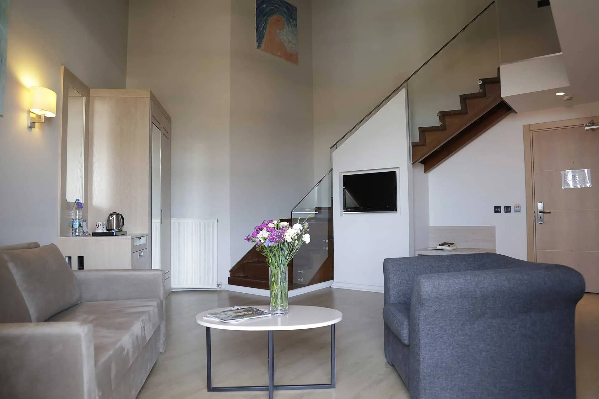 You will feel at home in our 2-story designed rooms consisting of 1 bedroom and 1 living room. Our rooms feature MiniBar, satellite TV broadcast, BBC channel, music channel, telephone, internet, bathroom telephone, shower cabin, split air conditioning + central heating, hair dryer, safe deposit box, balcony, and parquet flooring. Extra bed cannot be added; a sofa bed is already available.